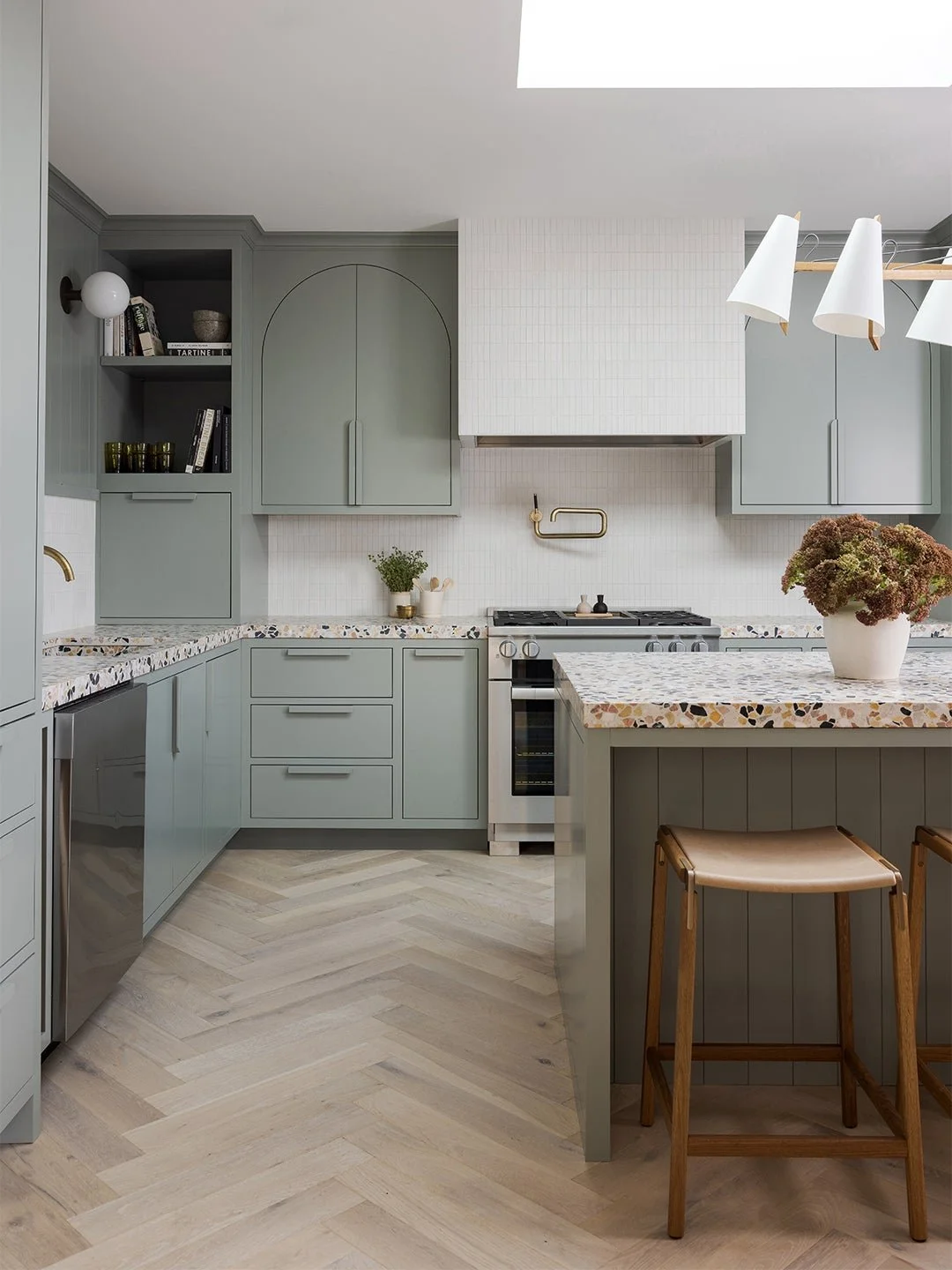 Channeling the surrounding neighborhood, the color palette we chose is soft and coastal. Our clients, being born and raised San Franciscans, requested some meaningful elements that celebrate their beloved city–like the terrazzo countertops that echo the original terrazzo on the front steps of the home.